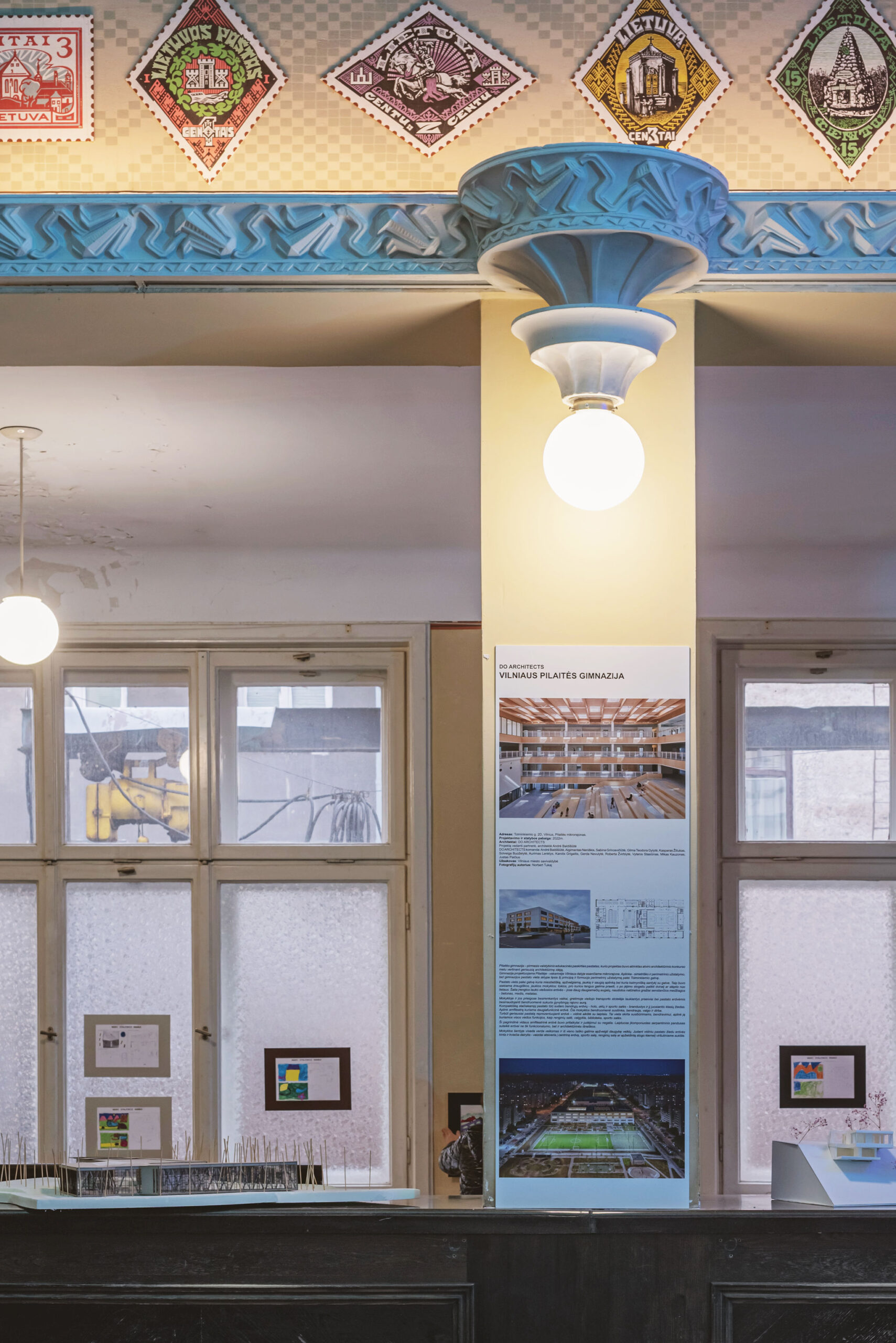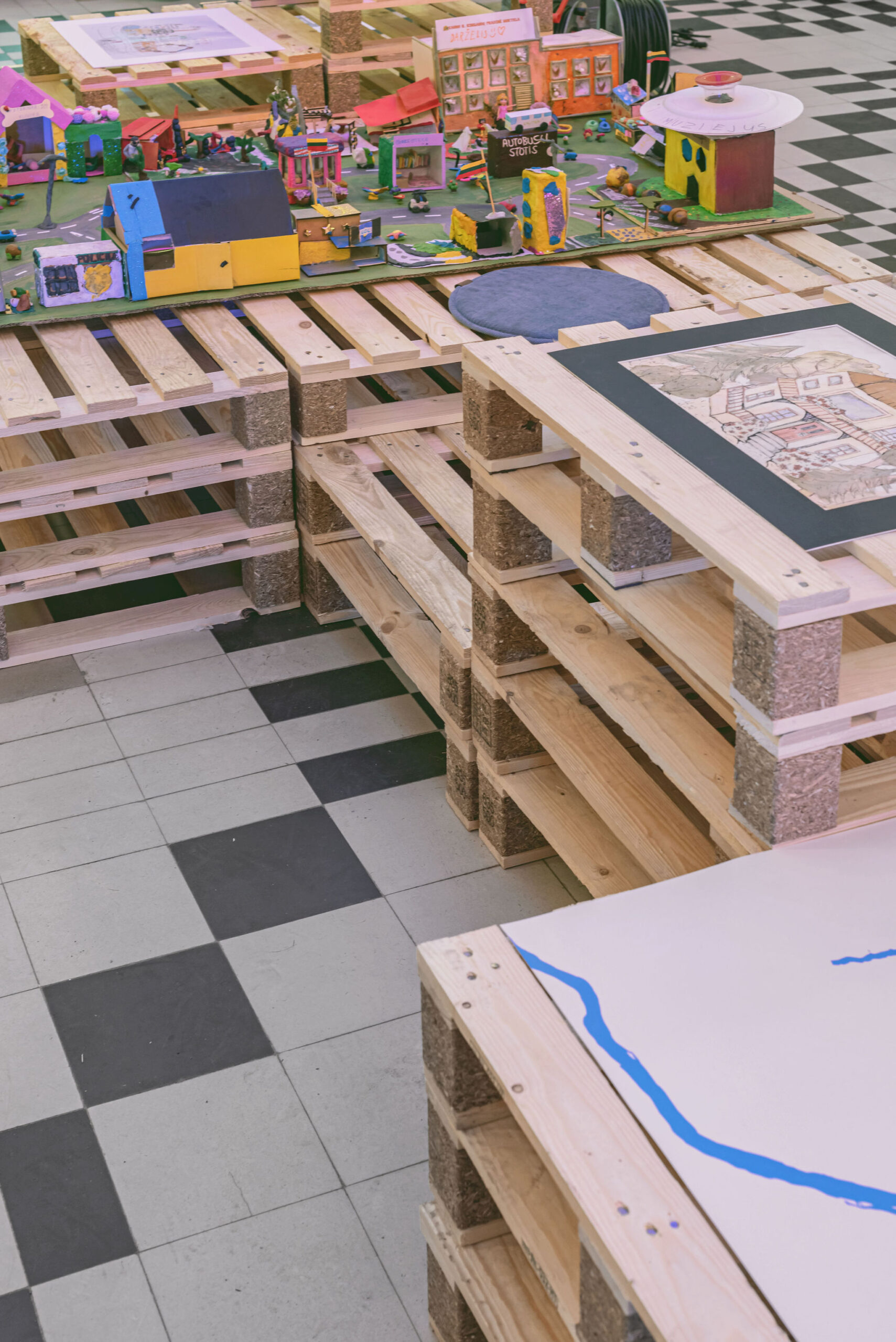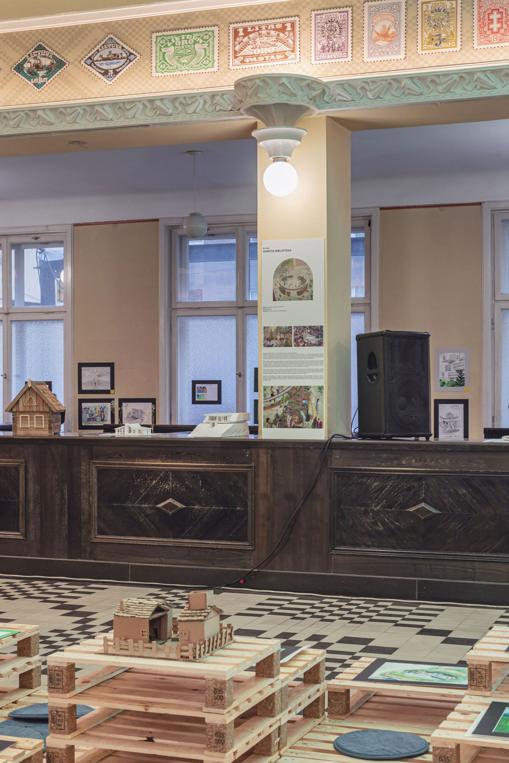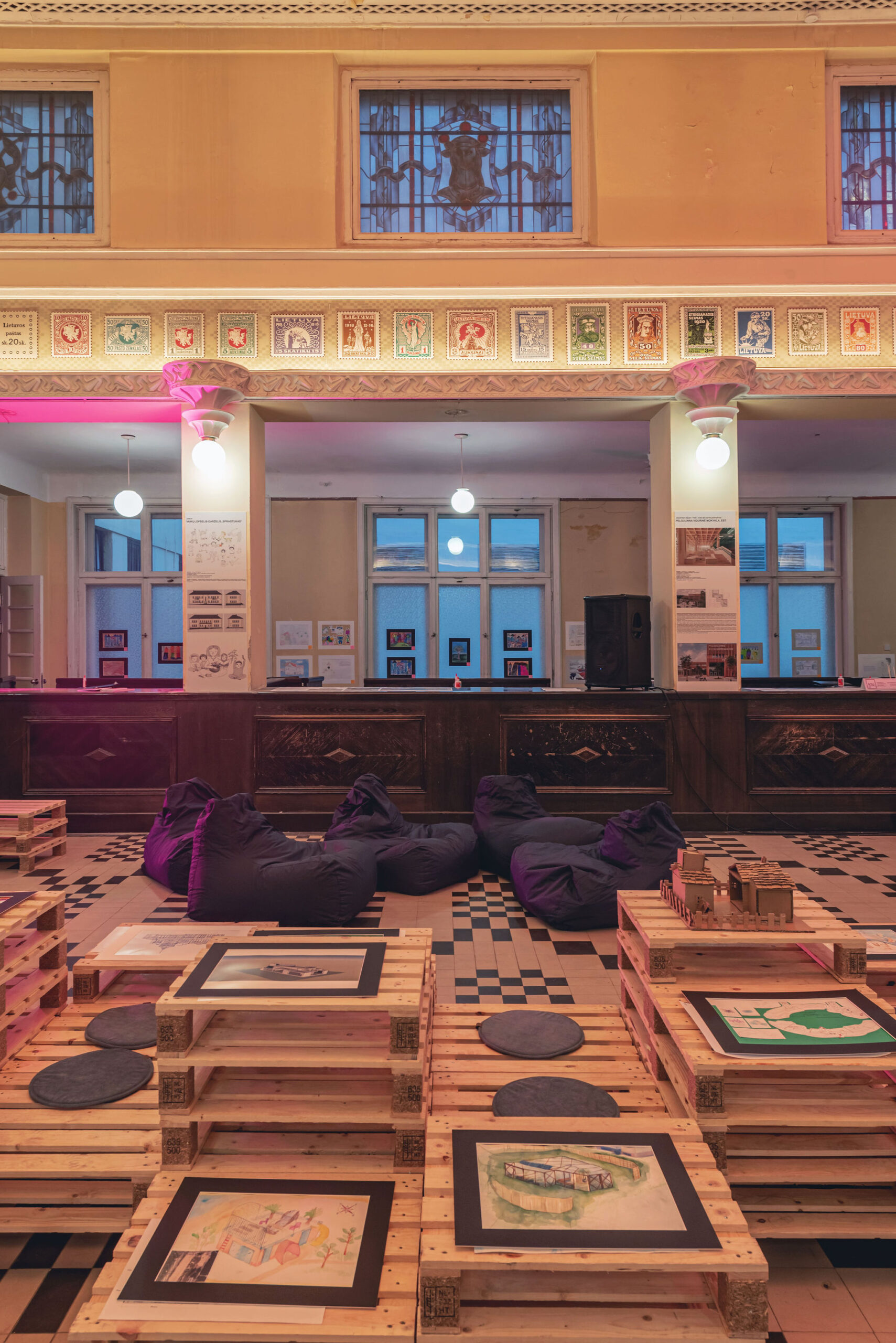 The festival took place in the former Central Kaunas Post Office building, a significant architectural heritage site. The exhibition and educational zones were arranged on the ground floor of the building, primarily in the main operations hall. The basis of the exhibition design consisted of reused wooden pallets, from which a long structure of varying heights was formed. This structure was used to display the children’s models and drawings.