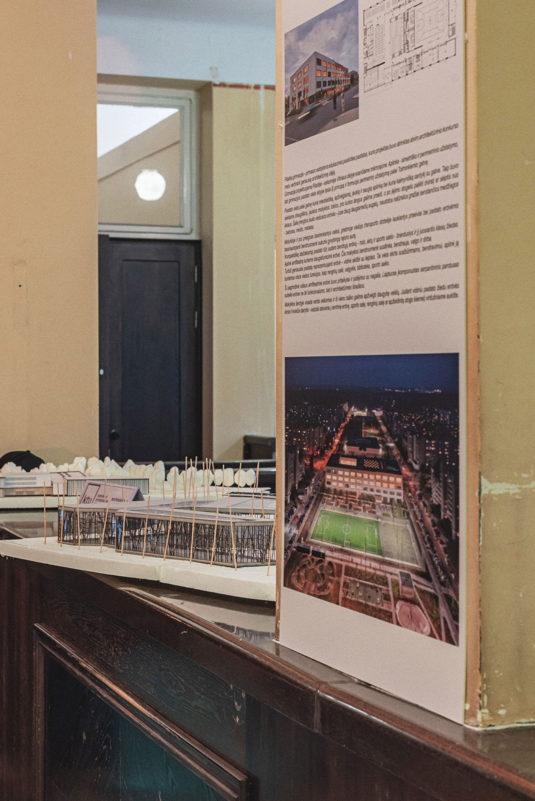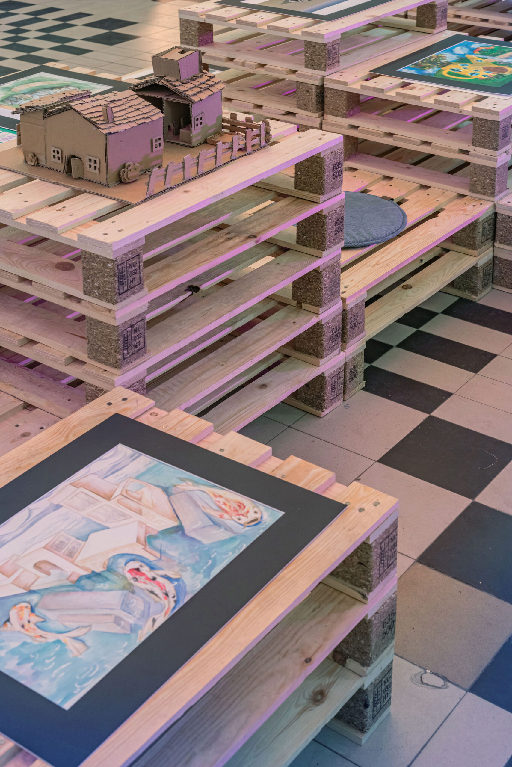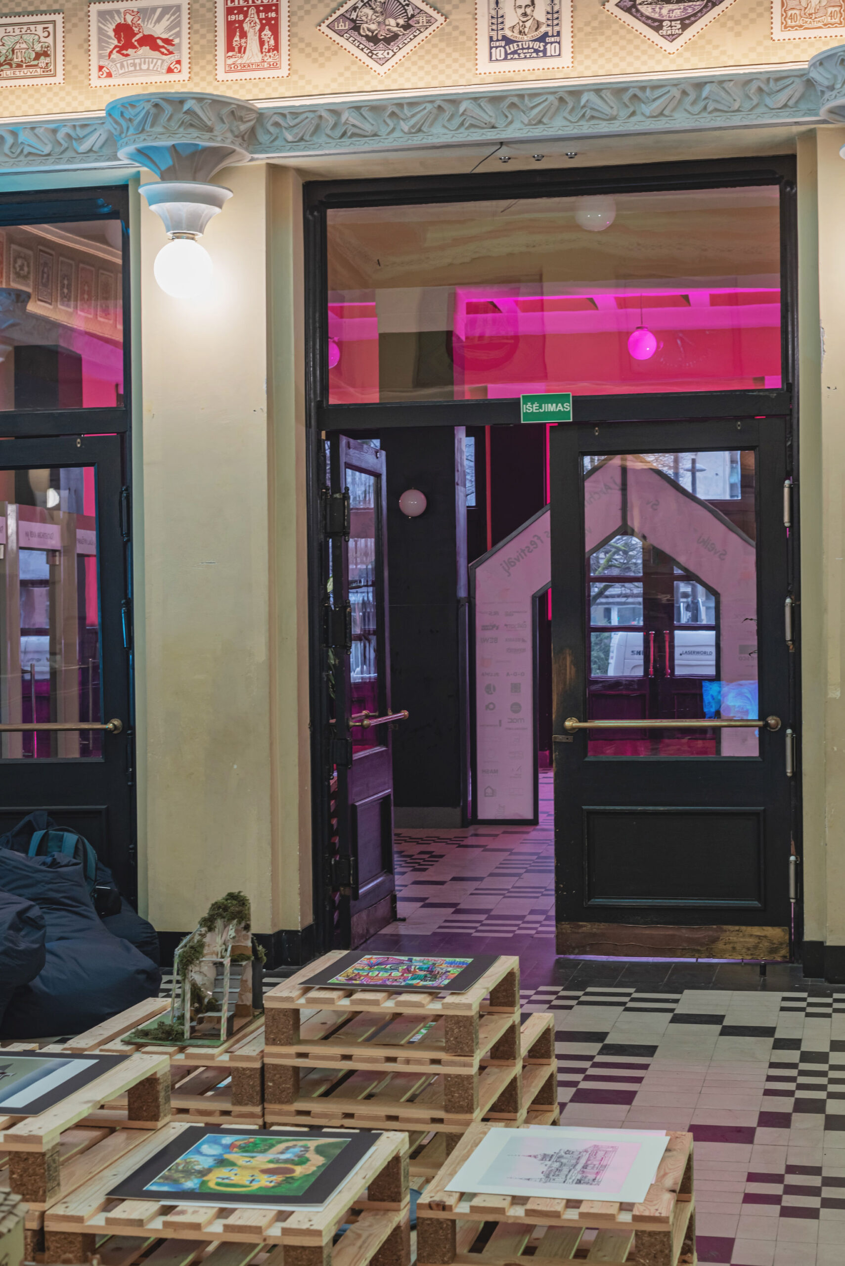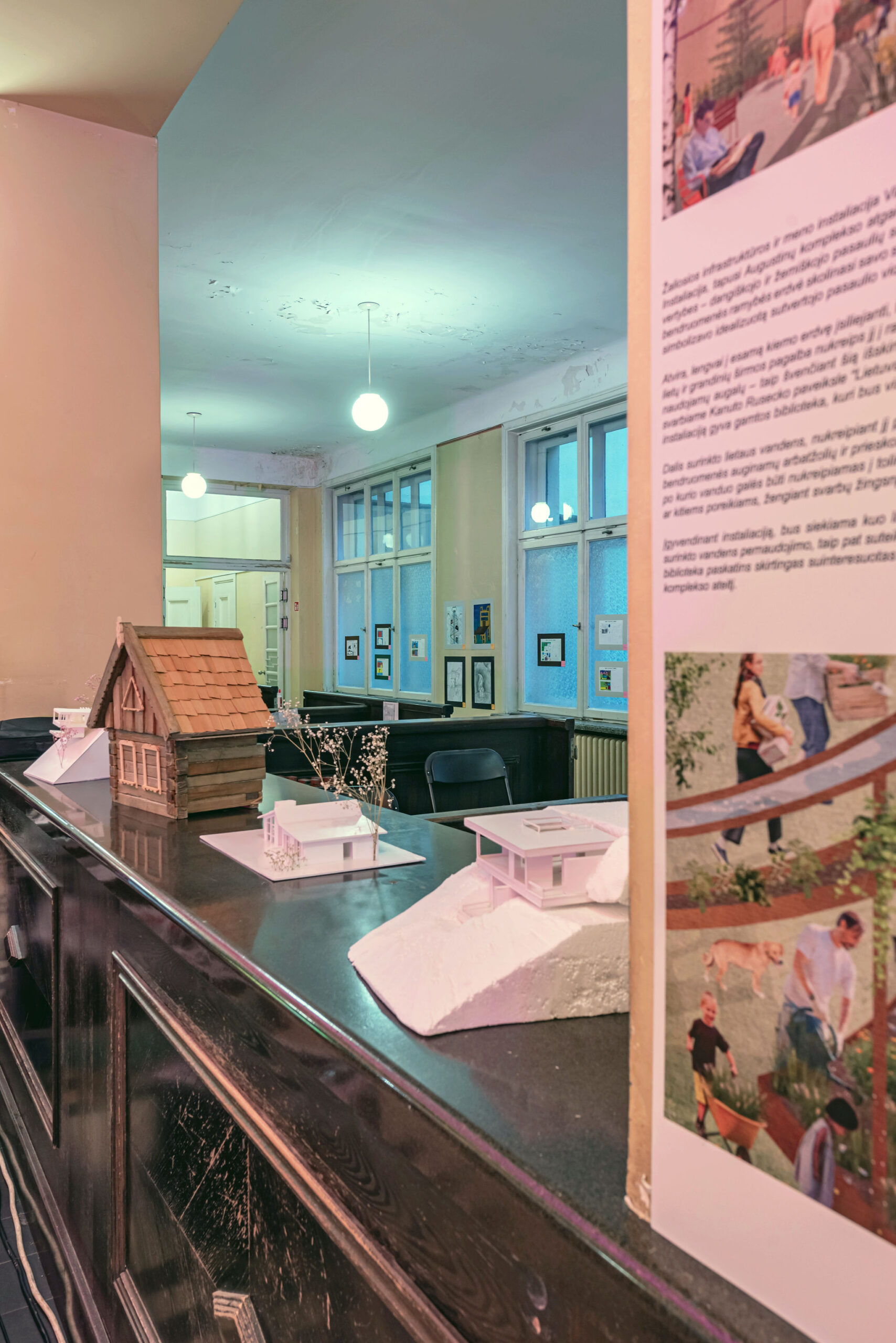 The festival took place in the former Central Kaunas Post Office building, a significant architectural heritage site. The exhibition and educational zones were arranged on the ground floor of the building, primarily in the main operations hall. The basis of the exhibition design consisted of reused wooden pallets, from which a long structure of varying heights was formed. This structure was used to display the children’s models and drawings.